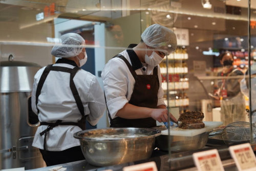 服务提升是此次调改的另一大亮点。门店不仅保留了砍肉、杀鱼、活鲜打氧、水果清洗去皮切片等常规服务,还推出了多项特色服务:如购买天农清远走地鸡可免费帮忙烤制,调理牛排、法式羊排免费现煎,水果果切根据甜度编号并推荐品尝顺序,并提供蔬菜、肉禽、水果的试吃服务。